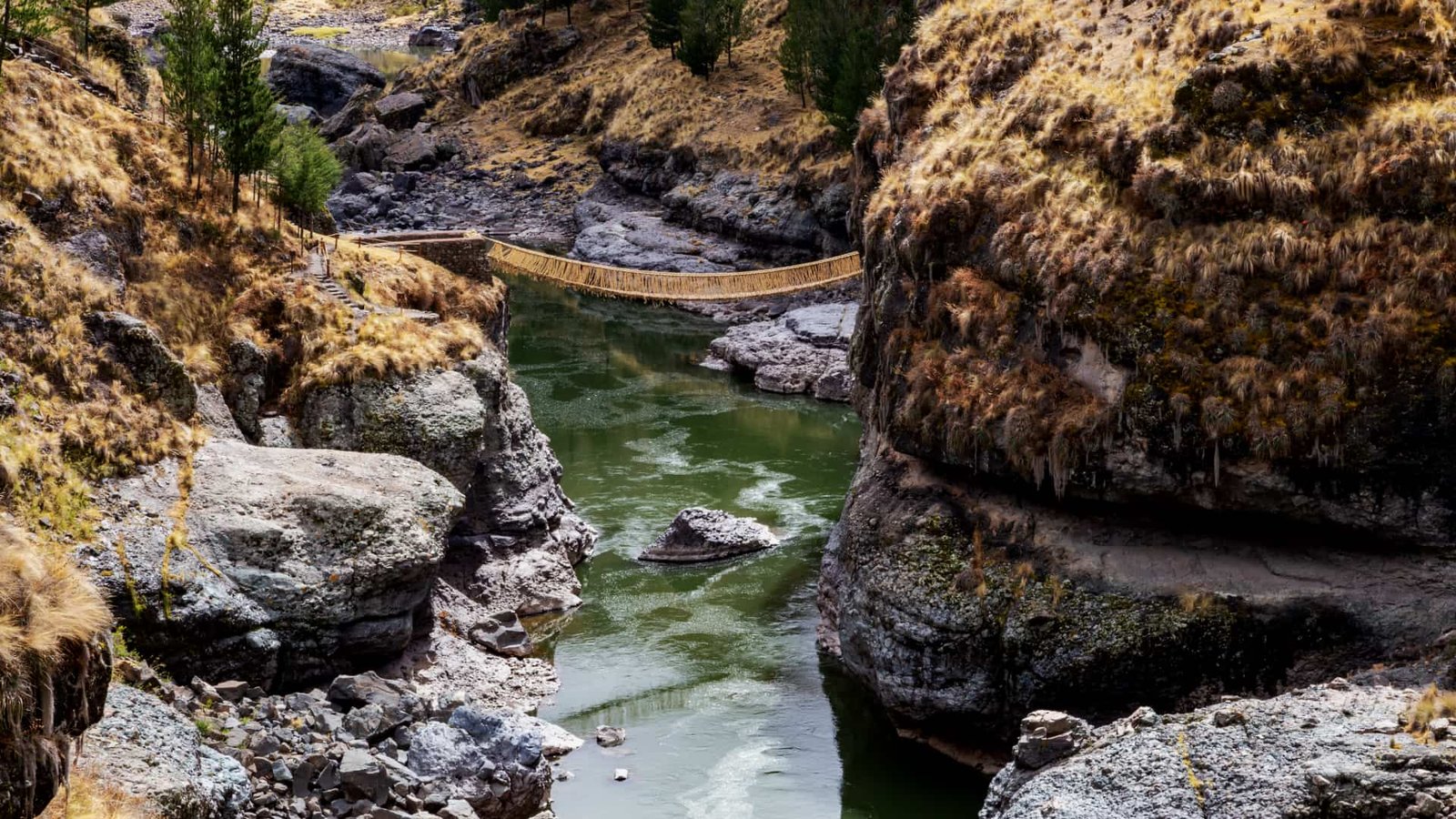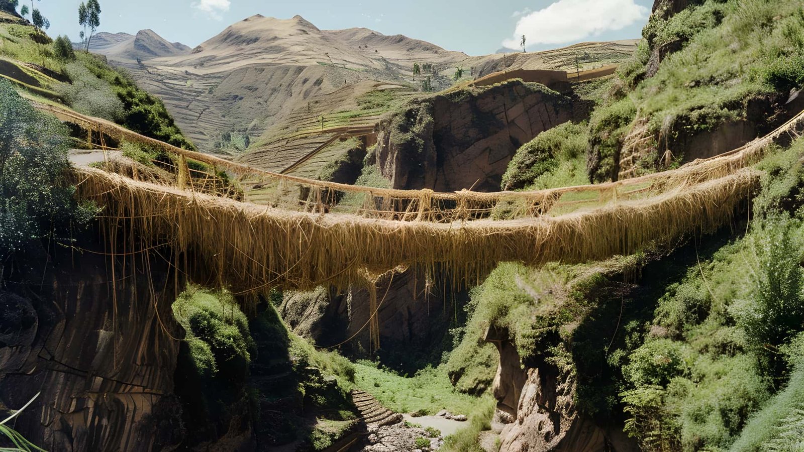 - 11:30 AM – Llegada al Puente Q’eswachaka: El momento cumbre. Descenderemos hasta el cañón del río Apurímac para conocer el puente tejido. Tendrás tiempo para cruzarlo (¡si te atreves!), tomar fotografías y aprender sobre el ritual de renovación anual.